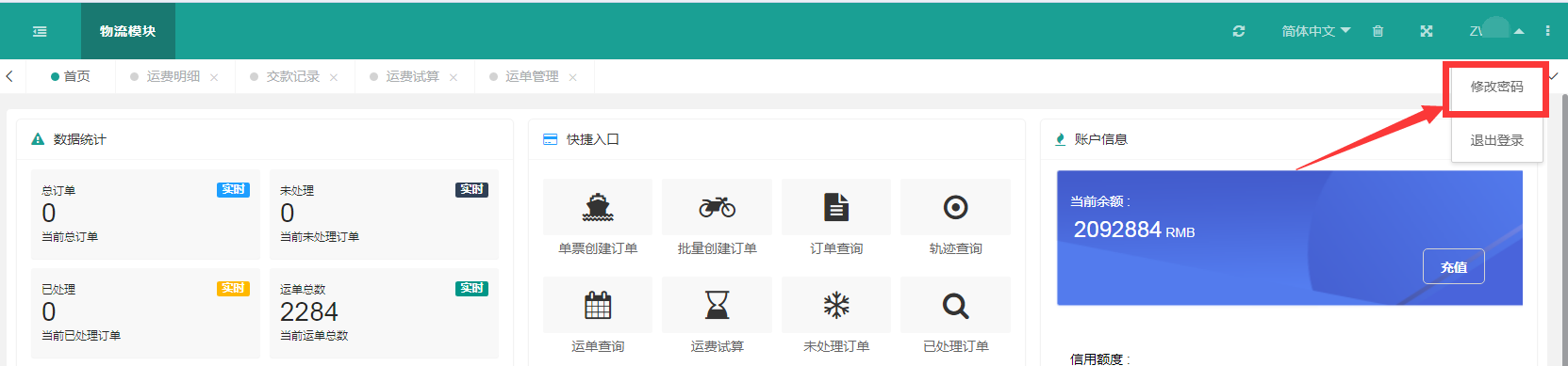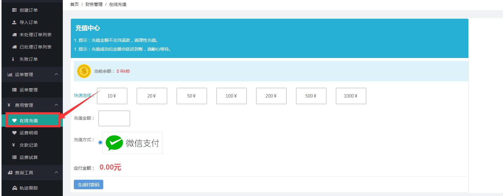 1、出货后查看欠费金额,点击充值后欠多少冲多少,有信用额的客户结款在信用额内即可,月结客户按账单金额进行对应