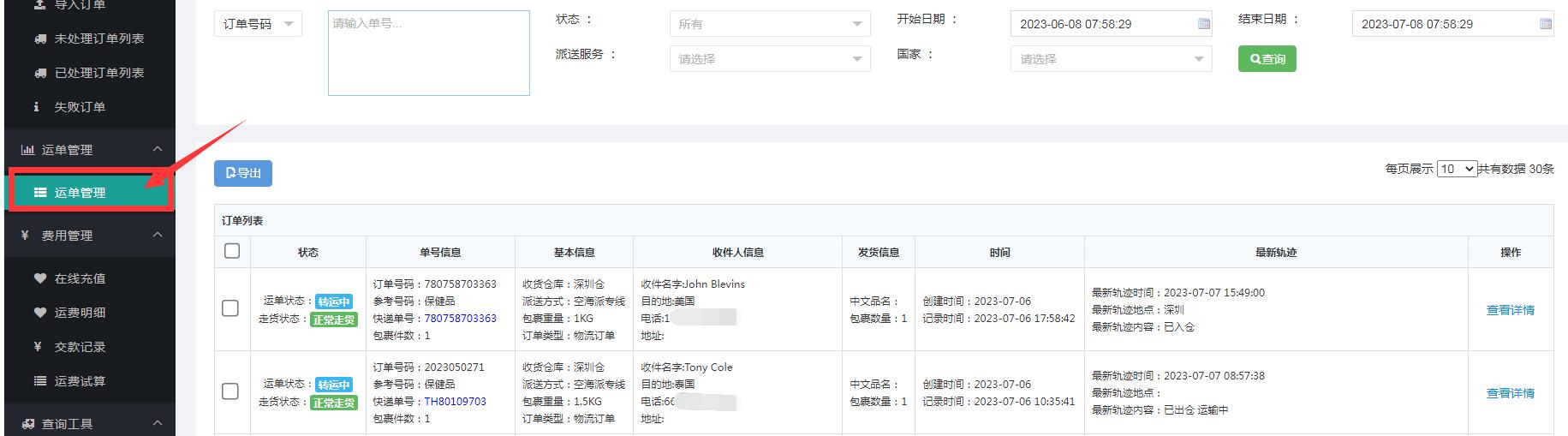 1、可导出所有走件记录轨迹 内含(原单、转单、快递类别、收件人名、货物签收状态)