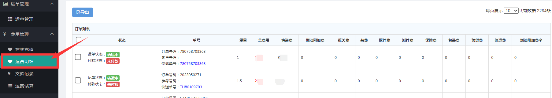 2、也可以点击“导出”按钮导出账单明细账单明细对应账目有(原单、品名、转单、快递类别、费用明细)