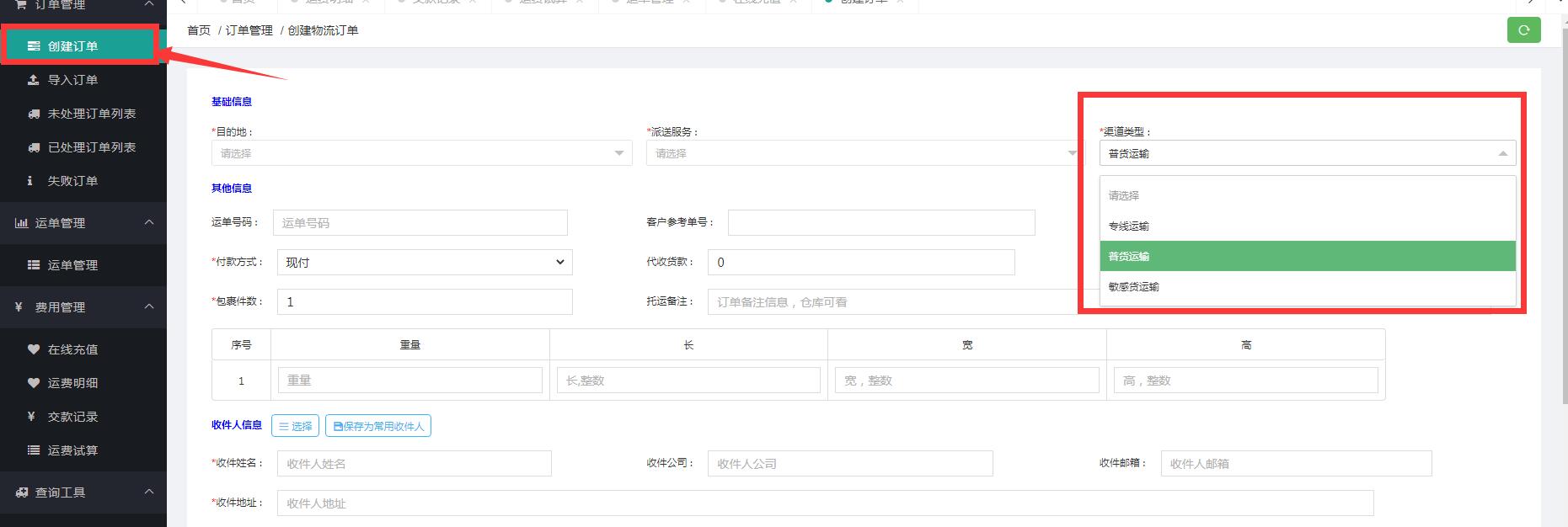 1、我司支持在线生成订单,点击创建订单针对小批量客户单票录入,导入订单是针对大批量客户表格形式导入。